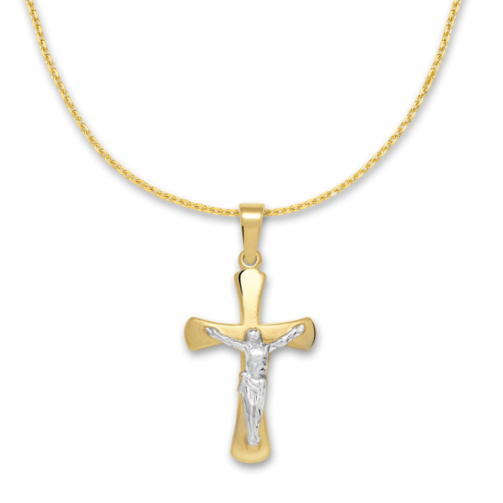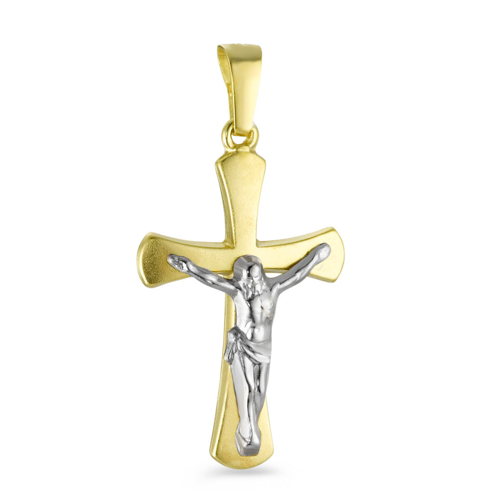 Eleganter Kreuz-Anhänger aus 375er Gelbgold mit silberfarbener Christusdarstellung. Dieses zeitlose Schmuckstück verbindet Tradition mit stilvollem Design – perfekt als Geschenk oder persönliches Accessoire. Hochwertige Verarbeitung garantiert langen Tragekomfort und beständigen Glanz.