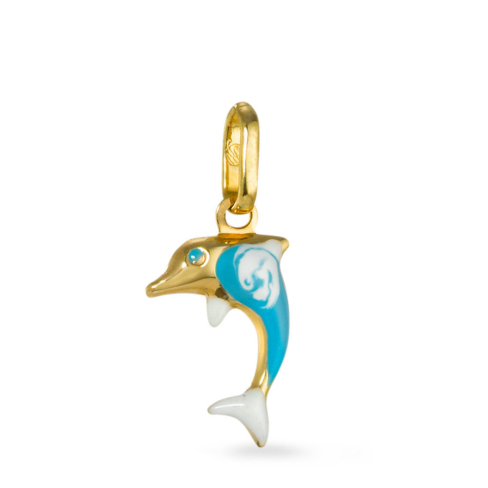 Süßer Mädchen Anhänger in Form eines Delfins aus hochwertigem 375er Gelbgold. Der liebevoll gestaltete Delfin ist mit blau-weißer Emaille verziert und bringt Meeresfeeling zum Strahlen. Ein bezauberndes Schmuckstück, ideal als Geschenk oder zum Selbsttragen.
