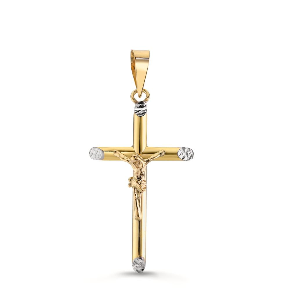 Eleganter Kreuz-Anhänger aus 375er Gelbgold mit filigraner Jesus-Darstellung. Die weißen Highlights an den Kreuzenden verleihen dem Schmuckstück einen besonderen Akzent. Ein zeitloses Symbol für Glauben und Stil, perfekt für jeden Anlass.