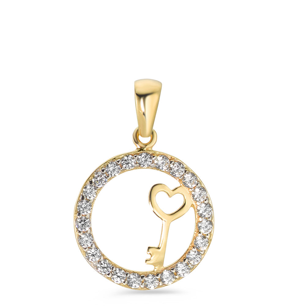 Eleganter Damenanhänger aus 375er Gelbgold, verziert mit funkelnden Zirkonia-Steinen. Das filigrane Herz-Schlüssel-Design im Kreis ist ein bezauberndes Symbol für Liebe und Verbundenheit. Perfektes Accessoire für jeden Anlass, zeitlos und stilvoll.