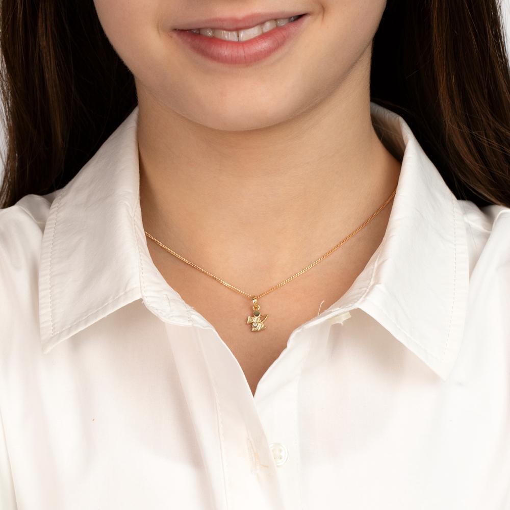 Zauberhafter Kinder-Anhänger aus hochwertigem 375er Gelbgold in Schutzengel-Form. Verziert mit funkelndem Zirkonia, sorgt dieser Anhänger für besonderen Schutz und begleitet Ihr Kind stilvoll im Alltag. Perfektes Geschenk zur Taufe oder als liebevolles Symbol.