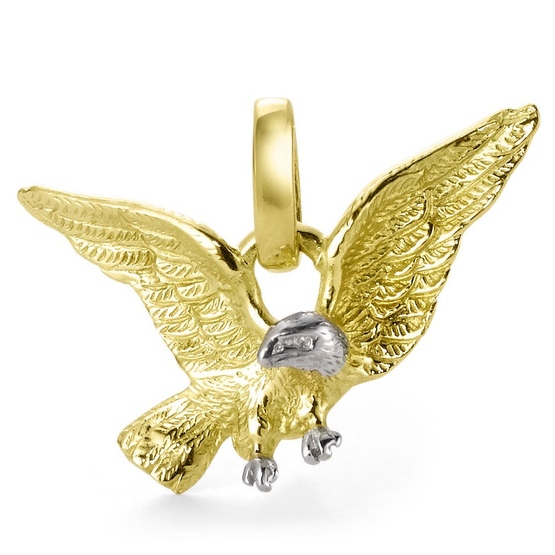 Dieser Herrenanhänger aus hochwertigem 750er Gelbgold zeigt einen kraftvollen Adler mit ausgestreckten Flügeln. Feine Details und die dezente Kombinationsfassung in Weißgold verleihen dem Schmuckstück eine maskuline Eleganz. Perfekt als symbolträchtiges Accessoire oder Geschenk.