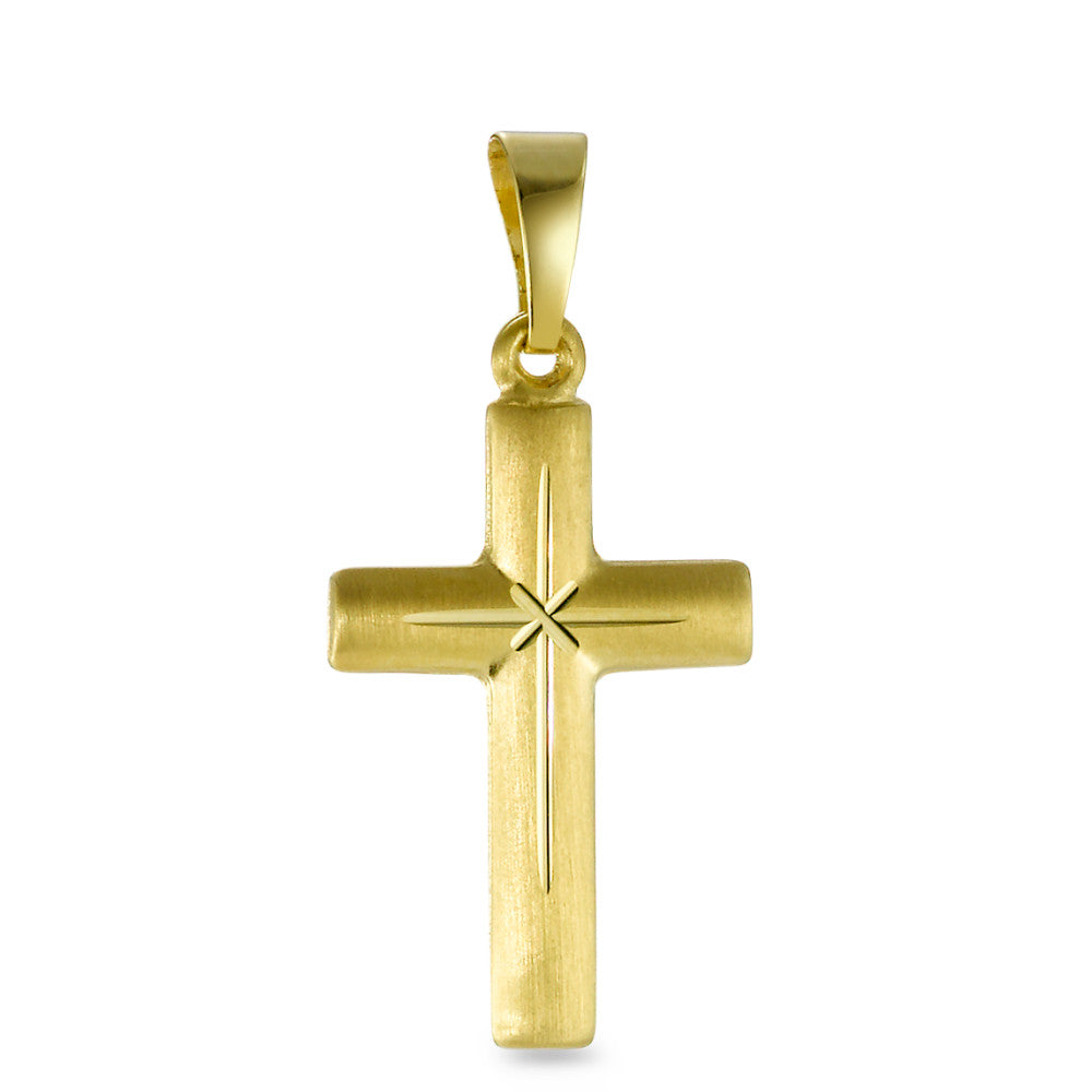 Eleganter Kreuz-Anhänger aus 750er Gelbgold, perfekt für jeden Anlass. Mit dezenter Gravur in der Mitte verleiht dieser klassische Anhänger Ihrem Schmuckset eine zeitlose Note. Hochwertig verarbeitet und langlebig, ideal als Geschenk oder für den eigenen Stil.