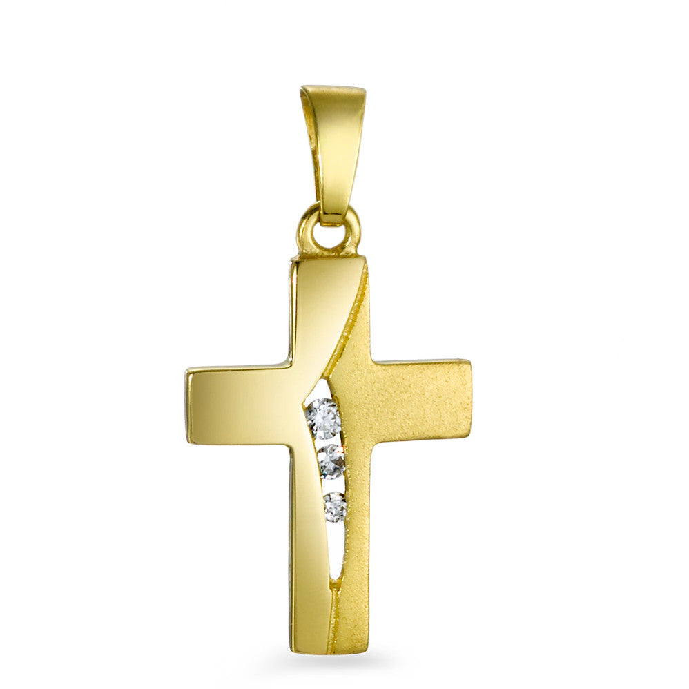 Eleganter Kreuz-Anhänger aus 750er Gelbgold mit drei funkelnden Zirkonia-Steinen. Modernes Design kombiniert polierte und matte Flächen, ideal als stilvolles Schmuckstück für jeden Anlass. Perfekt als Geschenk oder für den eigenen edlen Look.