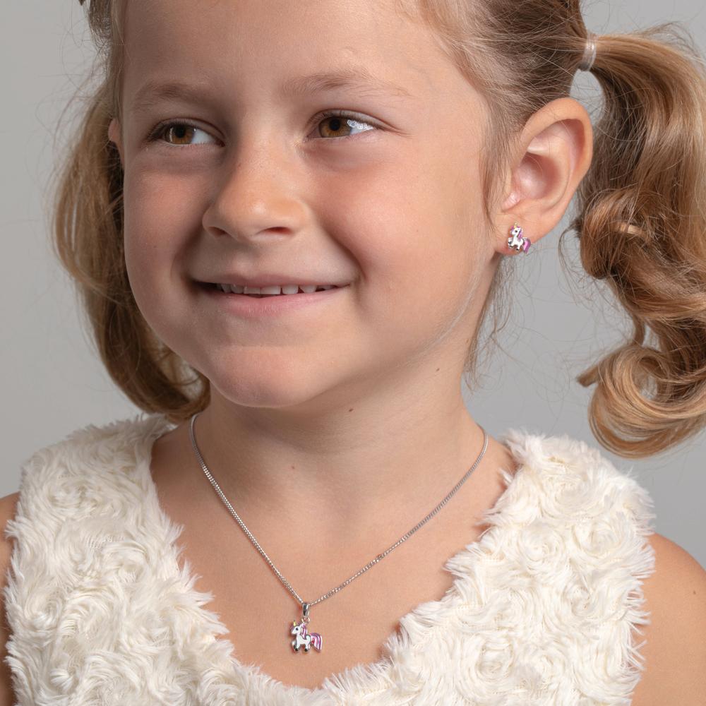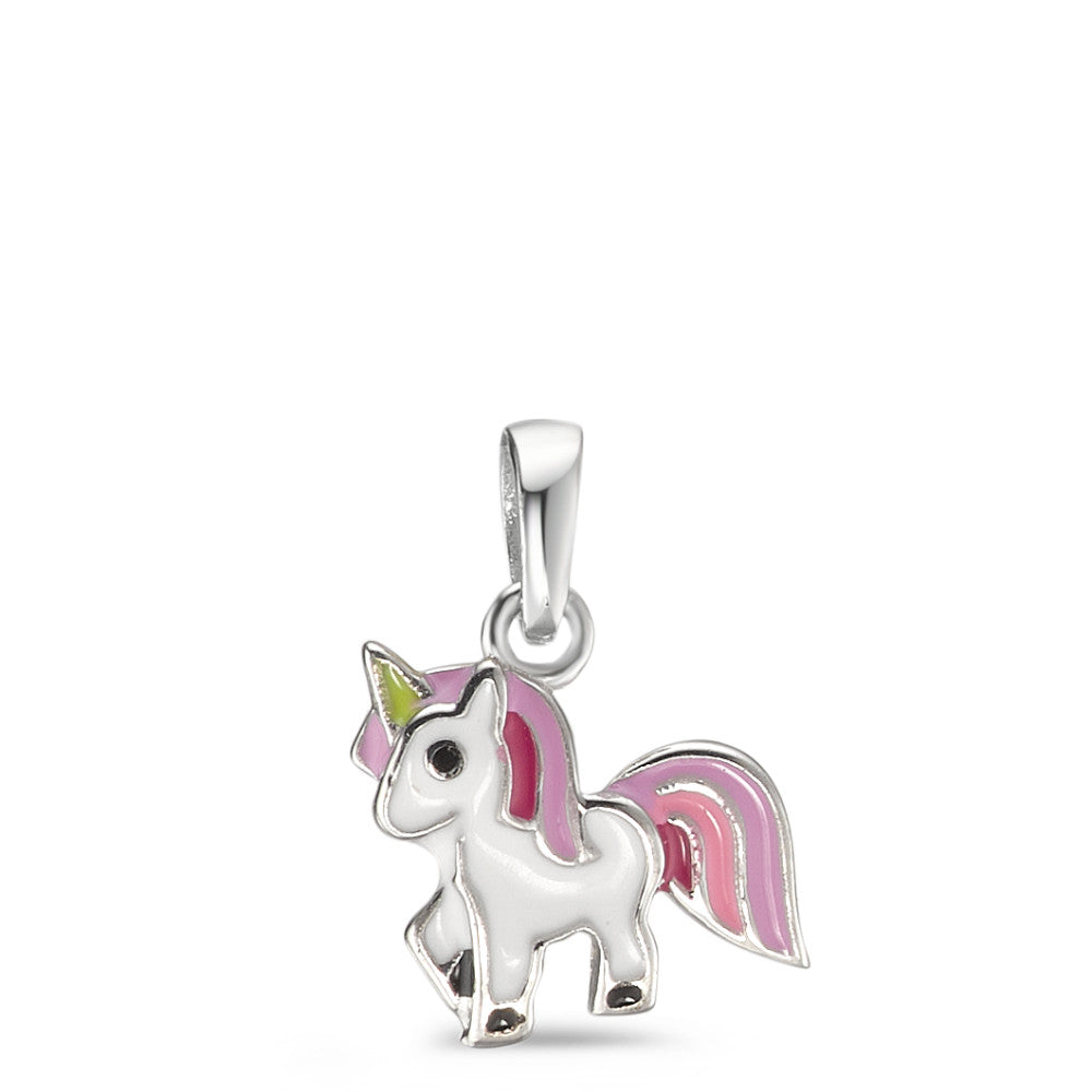 Zauberhafter Einhorn-Anhänger aus hochwertigem Silber, liebevoll gestaltet mit buntem Emaille in Weiß, Rosa und Grün. Perfekt für Mädchen, die Märchen und Fantasie lieben. Ein süßes Accessoire, das jedem Outfit einen funkelnden, magischen Akzent verleiht.