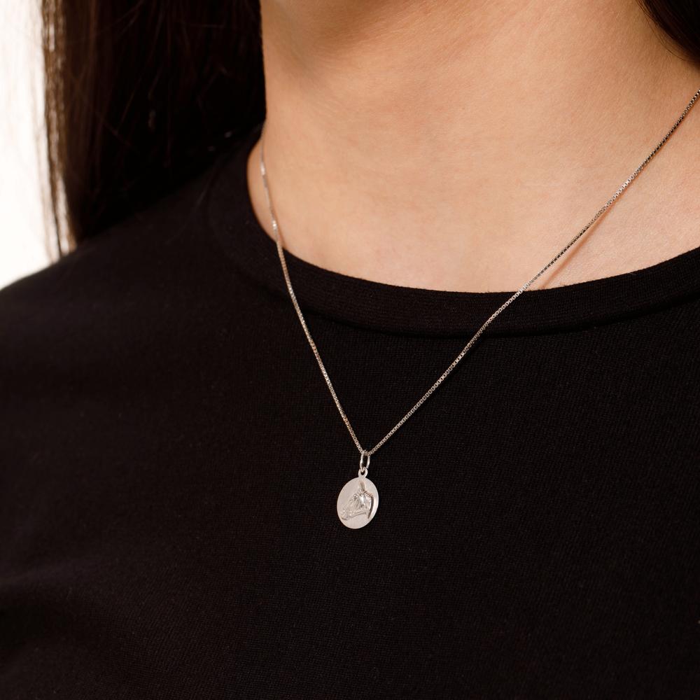 Dieser silberne Anhänger für Mädchen zeigt ein detailliertes Pferdekopf-Design auf runder Platte. Ein schönes Accessoire für Pferdeliebhaber, das sich ideal als Geschenk oder zur Ergänzung einer Halskette eignet. Hochwertig verarbeitet, sorgt er für einen liebenswerten, eleganten Look.