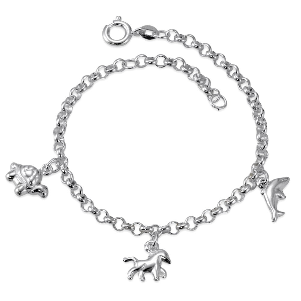 Dieses silberne Mädchen-Armband begeistert mit verspielten Anhängern in Form von Delfin, Schildkröte und Pferd. Fein gearbeitet, eignet es sich perfekt als Geschenk und zaubert leuchtende Kinderaugen. Verstellbare Länge für optimalen Tragekomfort.