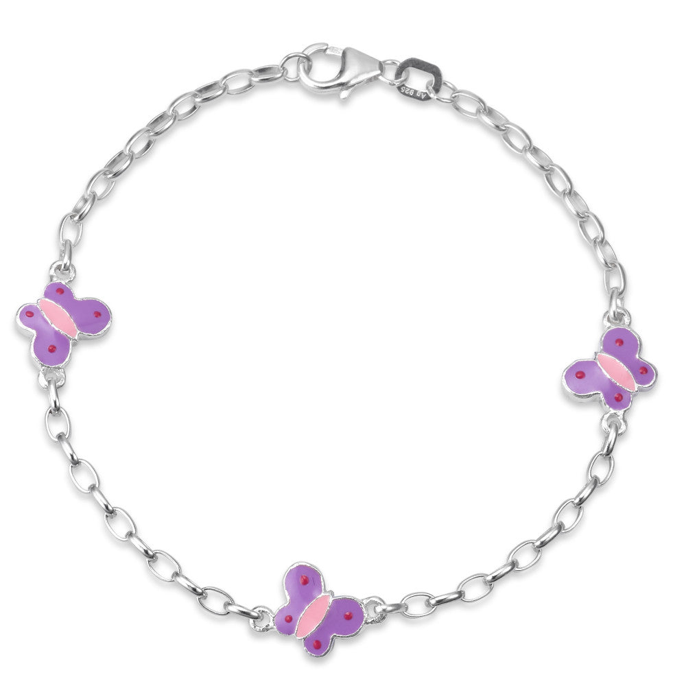 Dieses zauberhafte Mädchen-Armband aus glänzendem Silber besticht durch drei liebevoll gestaltete Schmetterlinge in zarten Rosa- und Lilatönen. Ein verspieltes Accessoire, das jeden Look kindgerecht und stilvoll ergänzt – perfekt für kleine Trendsetterinnen!