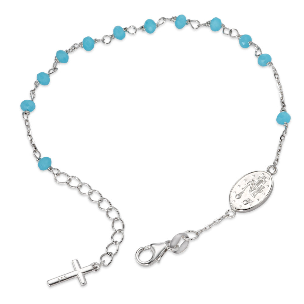 Elegantes Damen-Armband aus Silber, veredelt mit zarten blauen Kristallperlen. Das filigrane Design wird durch ein Kreuz und eine Medaille mit detailreicher Prägung abgerundet. Ein stilvolles Schmuckstück, das zu jedem Anlass passt und zeitlose Schönheit zeigt.