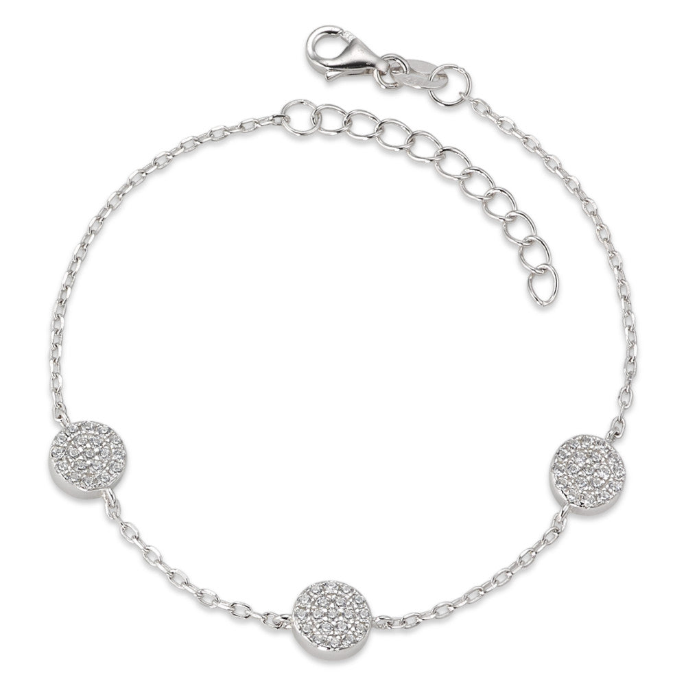 Elegantes Damen-Armband aus hochwertigem Silber, verziert mit funkelnden Zirkonia-Steinen. Das filigrane Design mit drei runden Elementen sorgt für einen stilvollen und zeitlosen Look. Perfekt für besondere Anlässe oder den Alltag. Länge variabel durch Verlängerungskette.