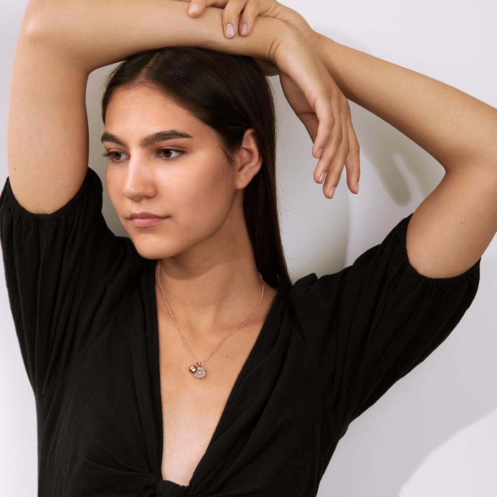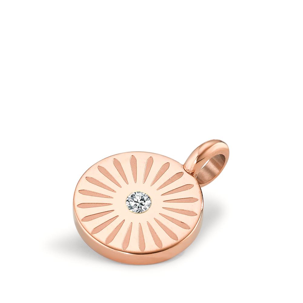 Eleganter Damen-Anhänger aus hochwertigem Edelstahl in Roségold. Verziert mit einem funkelnden Zirkonia in der Mitte und einem strahlenförmigen Muster. Zeitloses Design, das jeden Look stilvoll ergänzt – ideal als Geschenk oder für den eigenen Schmuckschatz.