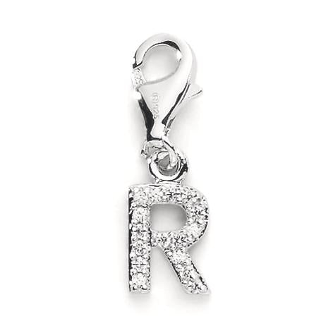 Eleganter Damen Charm aus hochwertigem Silber mit funkelnden Zirkonia-Steinen. Der Anhänger in Form des Buchstabens "R" lässt sich dank Karabiner leicht an Armbändern oder Halsketten befestigen. Perfektes Accessoire für persönliche Schmuckkreationen und als Geschenkidee.