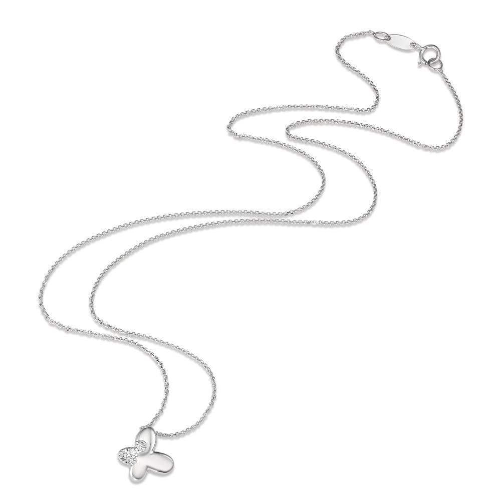Elegantes Damen-Collier aus 750er Weißgold mit filigranem Schmetterlings-Anhänger, verziert mit funkelnden Zirkonia-Steinen. Das zarte Design vereint zeitlose Schönheit und verspielte Leichtigkeit – das perfekte Accessoire für jeden Anlass.