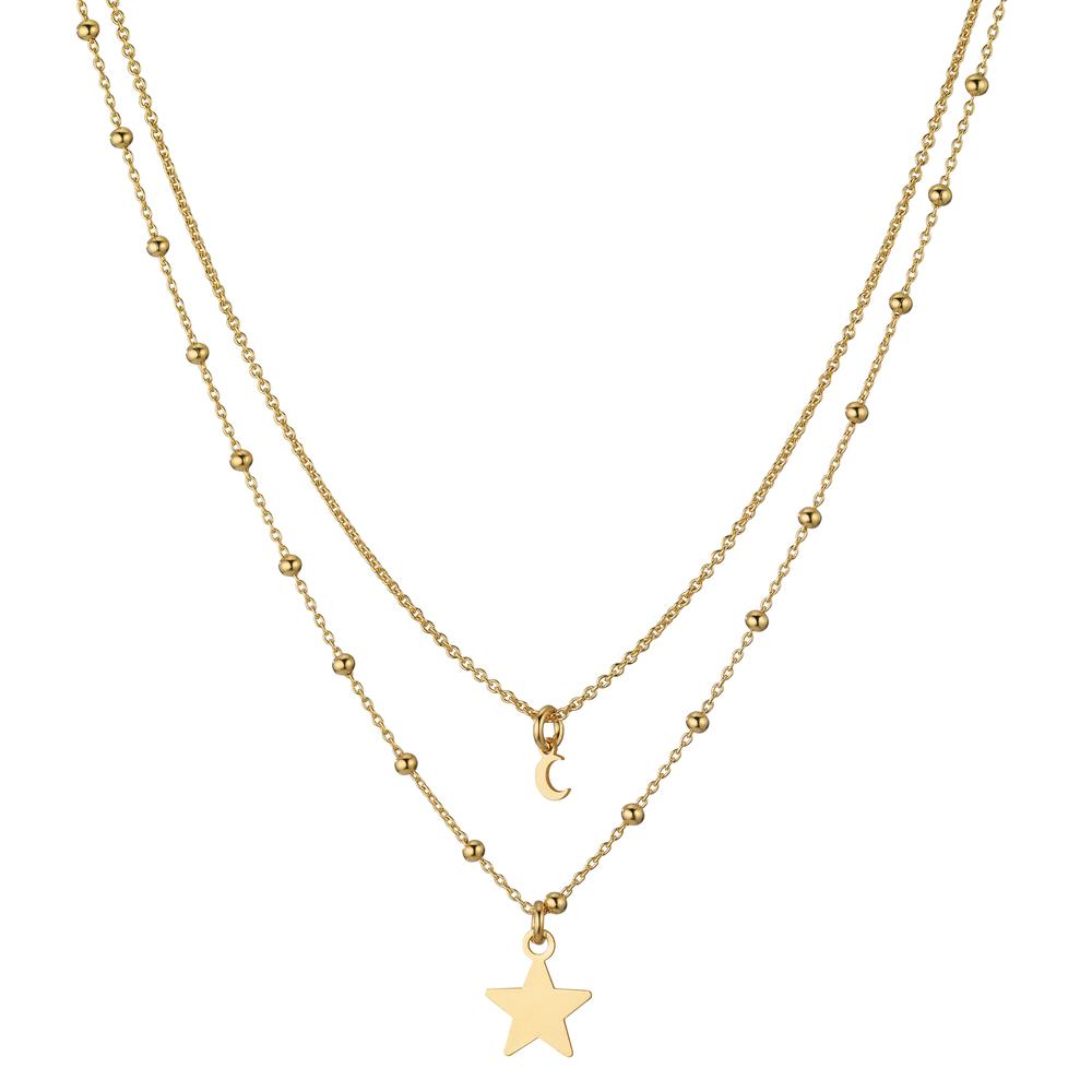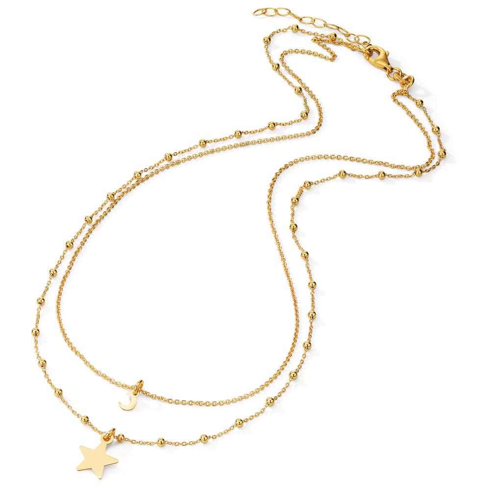 Elegantes Damen-Collier aus feinem Silber mit zarten Stern- und Mond-Anhängern. Die doppelte Kette mit kleinen Kugeln verleiht dem Schmuckstück eine moderne und stilvolle Note. Perfekt für jeden Anlass und ein attraktives Accessoire für jeden Look.