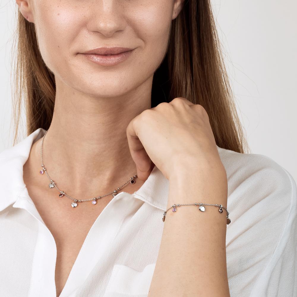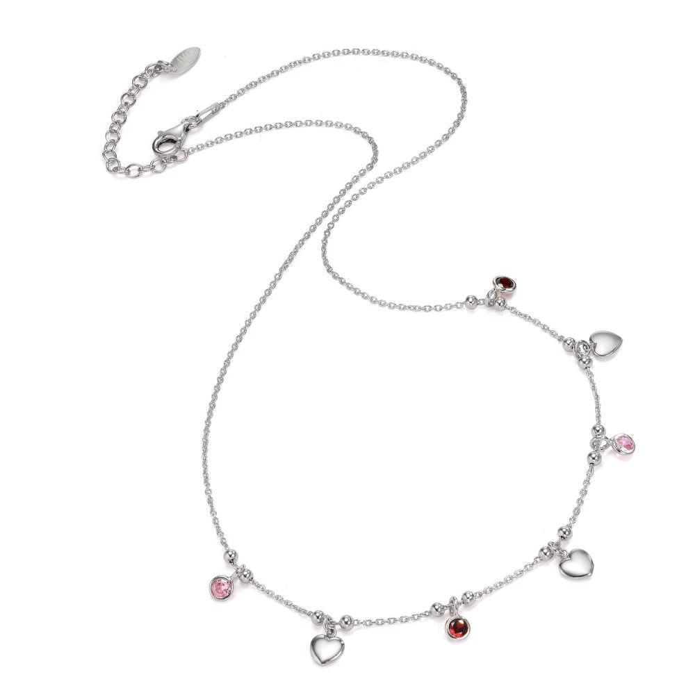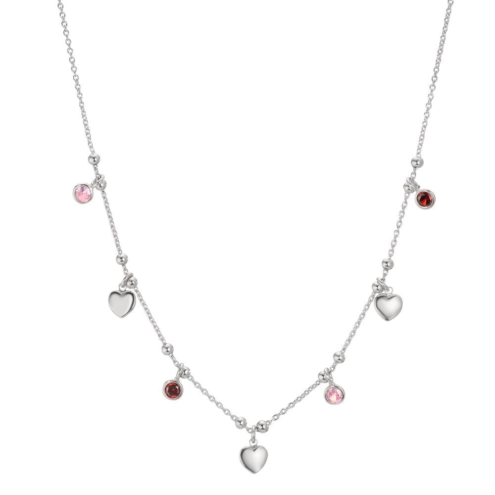 Elegantes Damen-Collier aus glänzendem Silber mit filigranen Herzanhängern und funkelnden Zirkonia-Steinen in Rot und Rosa. Ein romantisches Schmuckstück, das jedes Outfit stilvoll ergänzt und sich perfekt als Geschenk für besondere Anlässe eignet. Länge verstellbar.