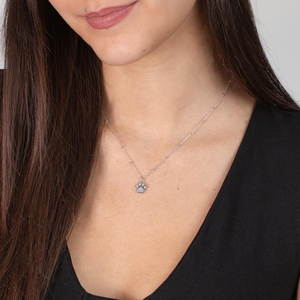 Elegantes Damen Collier aus hochwertigem Silber mit einem zarten Pfoten-Anhänger, verziert mit funkelnden Zirkonia-Steinen. Die feine Kette ist mit kleinen Silberkugeln besetzt und setzt ein charmantes Statement für Tierliebhaberinnen. Perfekt für jeden Anlass!