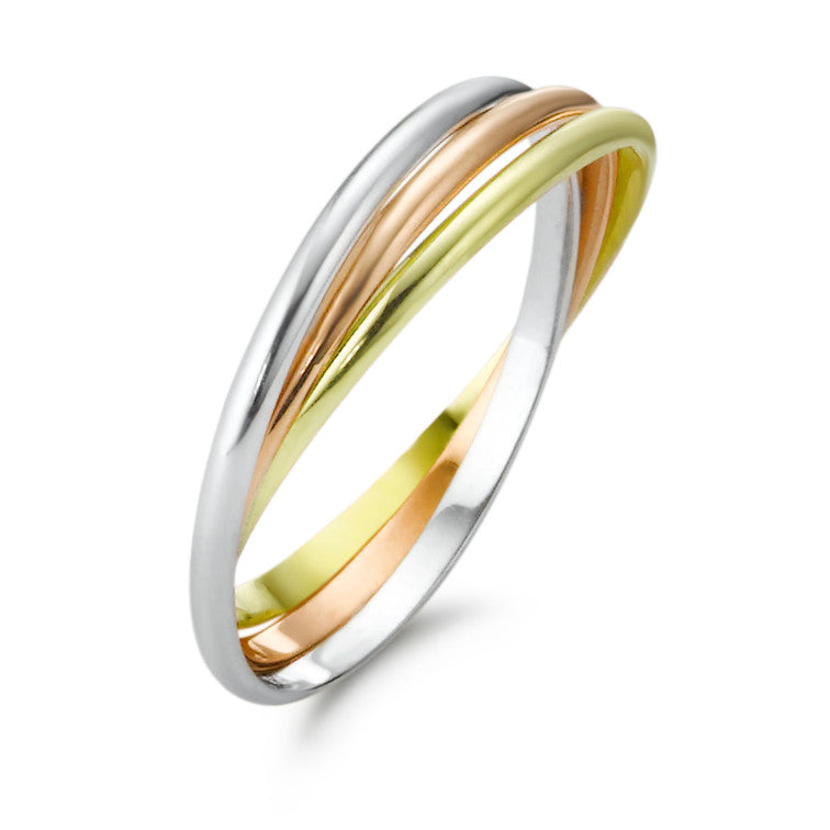 Eleganter Damen Fingerring aus hochwertigem 750er Gold in Gelb-, Weiß- und Rotgold. Die drei goldfarbenen Ringe sind kunstvoll verflochten und bieten einen zeitlosen, vielseitigen Look. Ein stilvolles Schmuckstück, das jedes Outfit perfekt ergänzt.