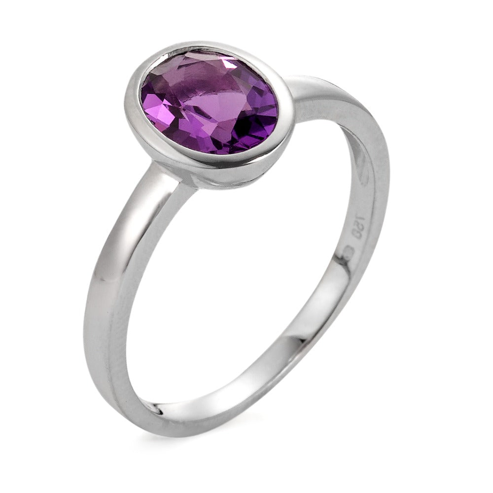 Eleganter Damenring aus 750er Weißgold mit ovalem Amethyst. Das strahlend violette Edelstein-Design verleiht diesem Schmuckstück zeitlose Schönheit und edle Raffinesse. Perfekt für besondere Anlässe oder als stilvolles Accessoire im Alltag.