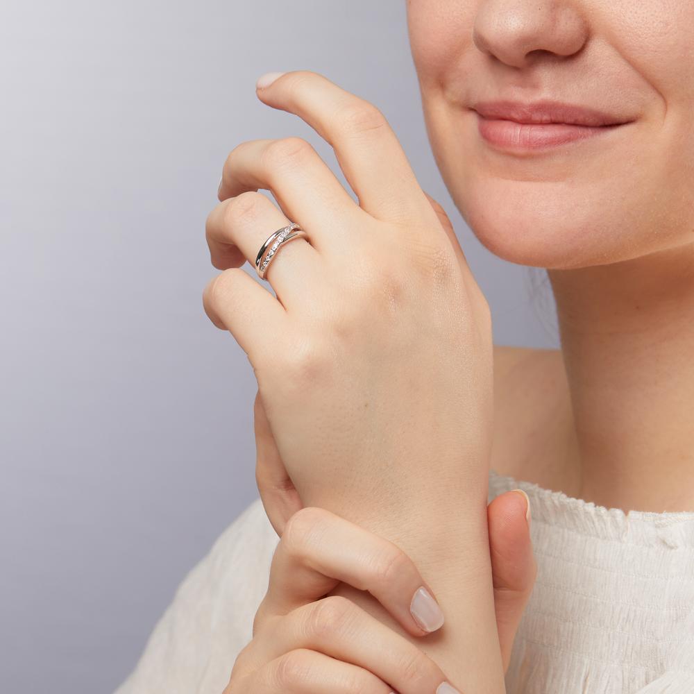 Eleganter Damen-Fingerring aus 750er Weißgold, verziert mit funkelnden Diamanten. Das moderne, geschwungene Design verleiht jedem Outfit eine stilvolle Note. Perfekter Begleiter für besondere Anlässe oder den Alltag – zeitlos, edel und hochwertig verarbeitet.