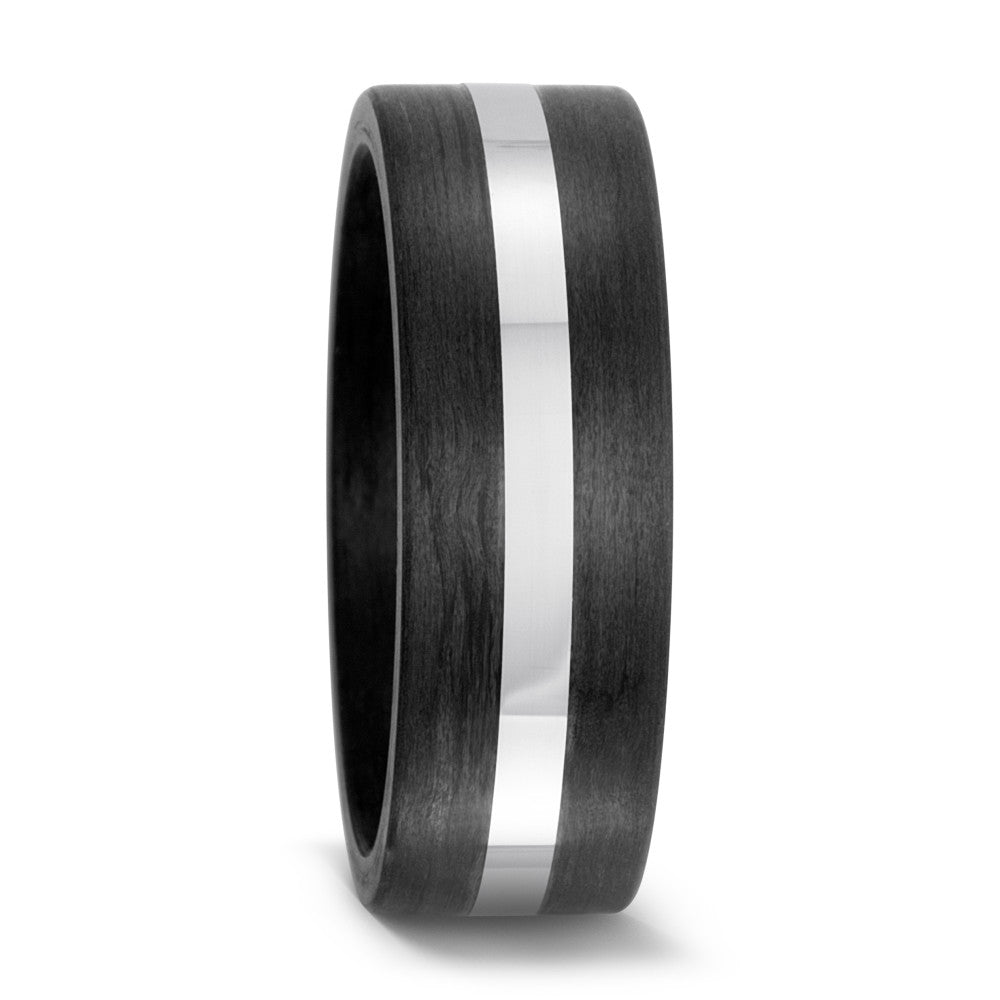 Moderner Herren Fingerring aus widerstandsfähigem Wolfram mit elegantem Carbon-Design. Der matte schwarze Carbon-Look wird durch einen glänzenden silbernen Einsatz in der Mitte harmonisch ergänzt. Ideal für stilbewusste Männer, die Langlebigkeit und Design schätzen.