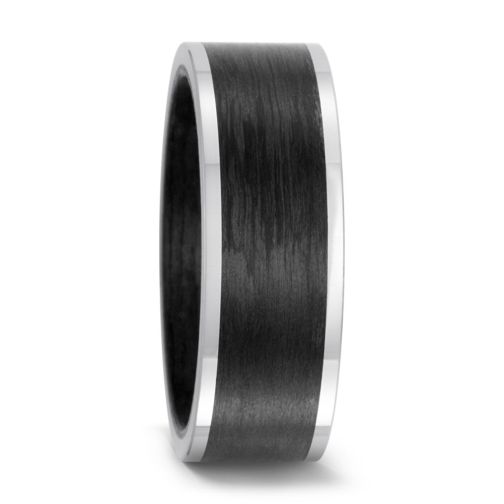 Moderner Herren Fingerring aus robustem Wolfram mit edlem Carbon-Inlay. Die Kombination aus glänzendem Metall und dunklem Carbon verleiht dem Ring eine maskuline und zugleich elegante Optik. Perfekt für stilbewusste Männer, die Wert auf Qualität und Design legen.