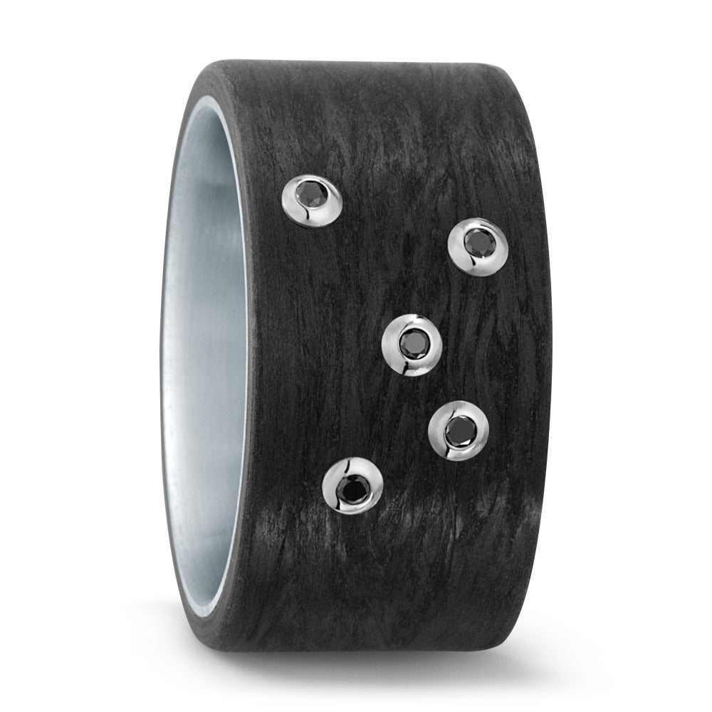 Moderner Damenring aus edlem Edelstahl und fein strukturiertem Carbon. Veredelt mit 750 Weißgold-Details und fünf schwarzen Zirkonia-Steinen, die für einen stilvollen, eleganten Look sorgen. Perfekt für Frauen, die zeitlose Eleganz mit innovativen Materialien schätzen.
