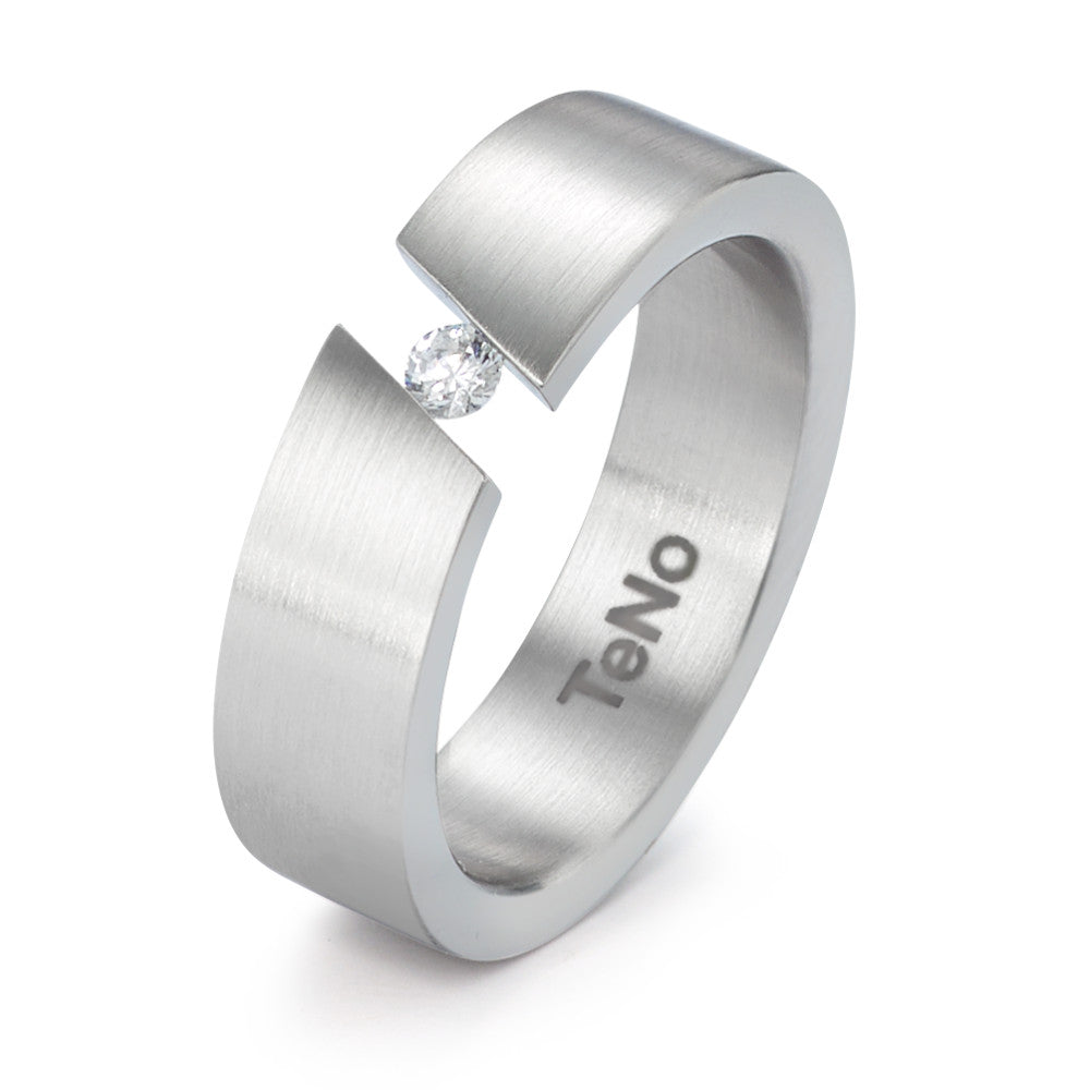 Moderner Damen Fingerring aus hochwertigem Edelstahl mit einem funkelnden Diamanten in der Mitte. Das matte Finish und das innovative Design machen diesen Ring zum eleganten und zeitlosen Accessoire für jeden Anlass. Robust, edel und perfekt für stilbewusste Frauen.