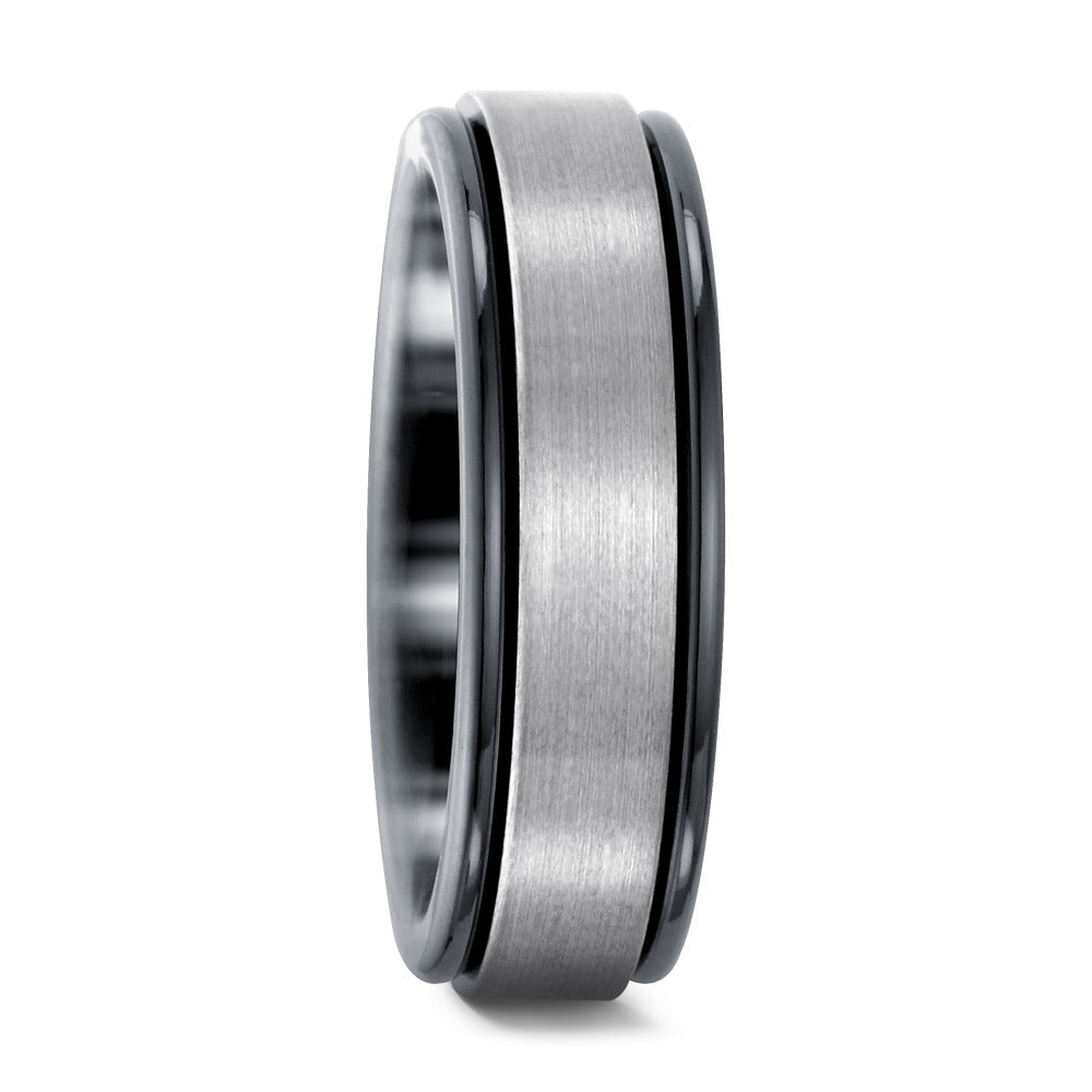 Moderner Herrenring aus langlebigem Wolfram mit elegantem Keramik-Einsatz. Die Kombination aus mattiertem Mittelteil und glänzenden Rändern verleiht diesem Fingerring zeitlose Eleganz und Robustheit. Perfekt für Alltag und besondere Anlässe.