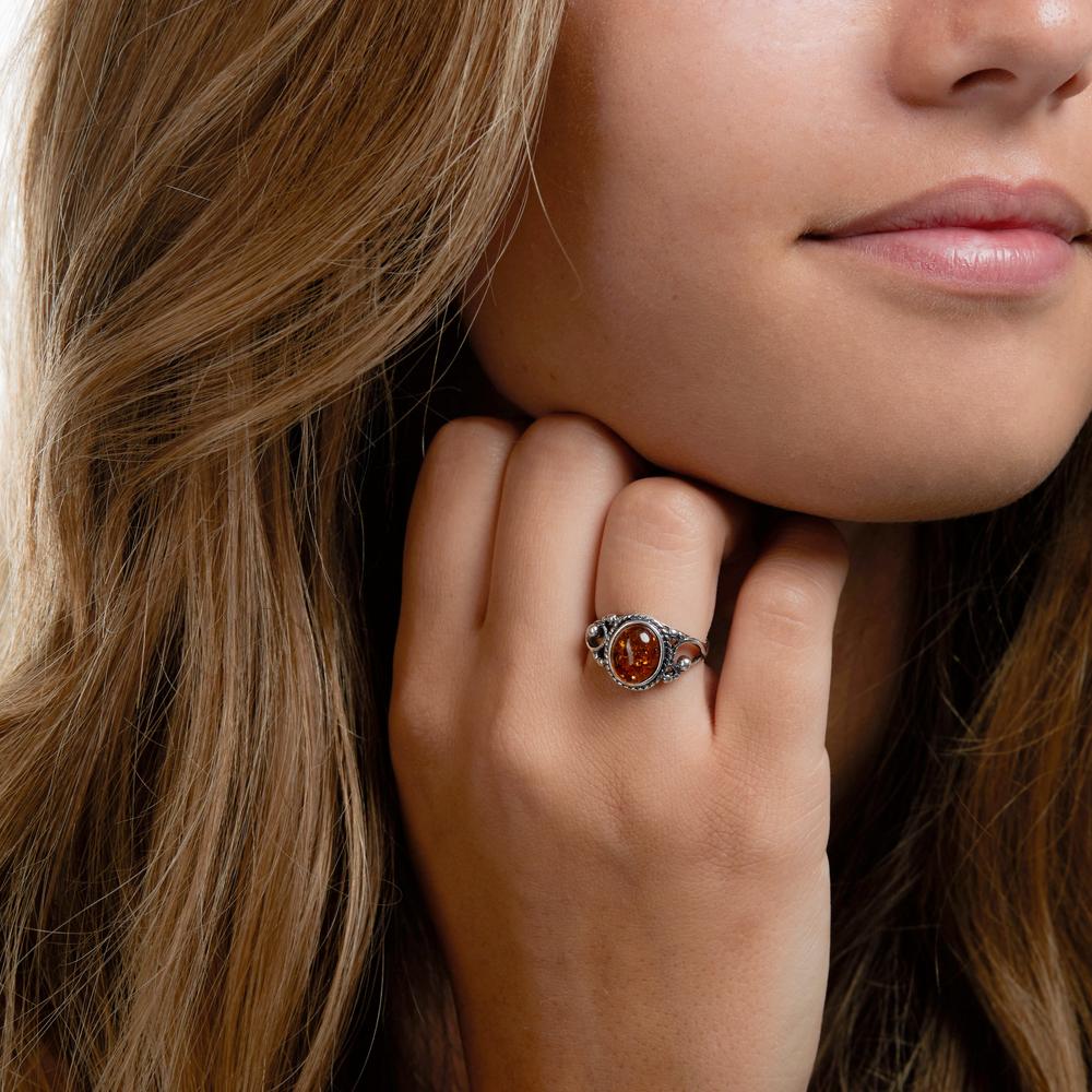 Eleganter Damen-Fingerring aus hochwertigem Silber, verziert mit einem warmen, leuchtenden Bernstein in Ovalform. Das filigrane Design mit kunstvollen Details macht diesen Schmuck zu einem zeitlosen Accessoire, das jedem Outfit eine natürliche und edle Note verleiht. Perfekt für besondere Anlässe oder den Alltag.