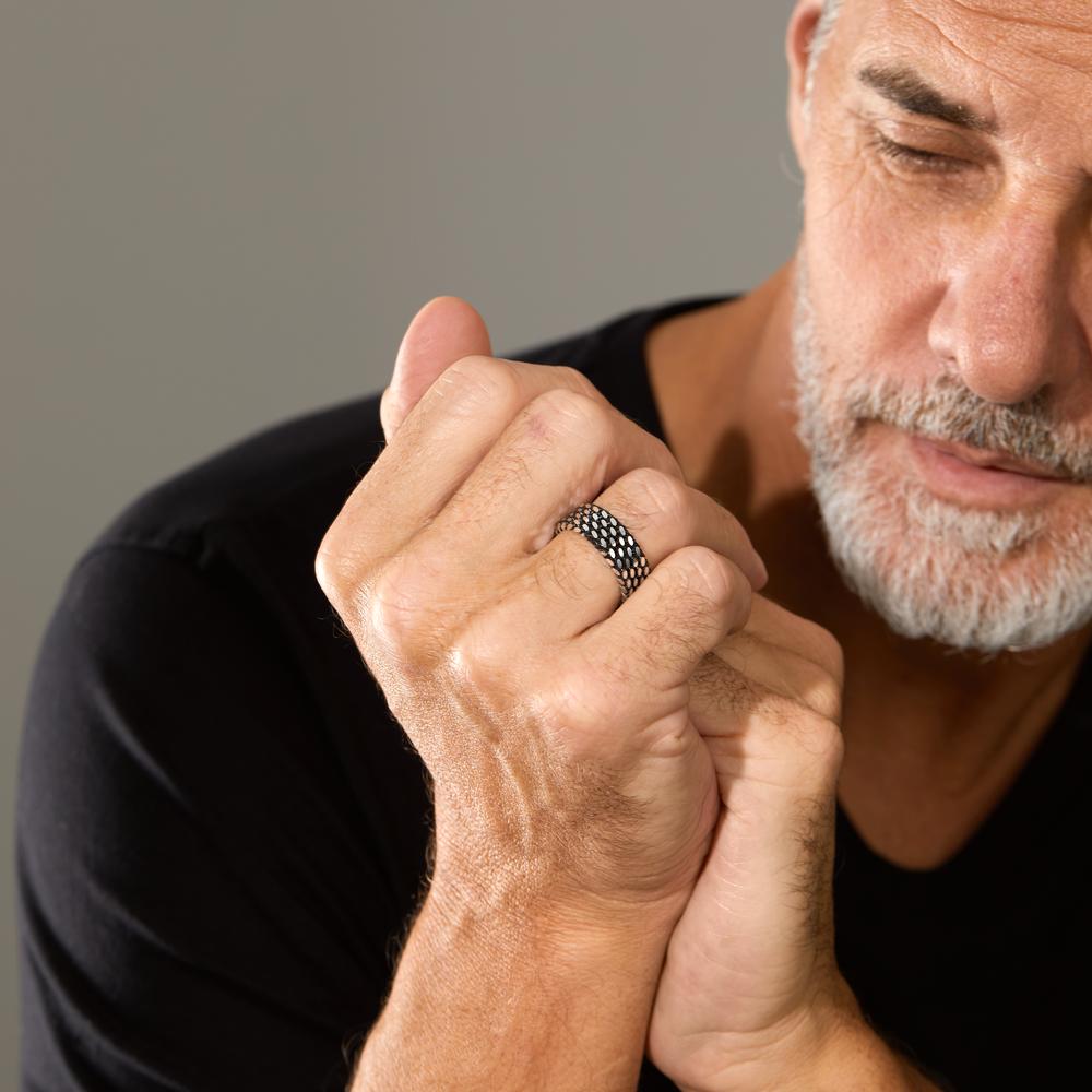 Moderner Herren Fingerring aus hochwertigem 925er Silber. Das auffällige Design mit Struktur und offener Optik verleiht jedem Outfit einen markanten und individuellen Look. Ideal für Männer, die besonderen Wert auf Stil und Qualität legen. Zeitlos und vielseitig tragbar.