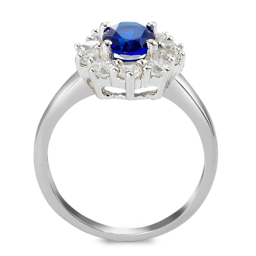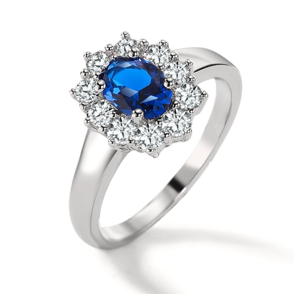Fingerring Silber Zirkonia blau, oval, Zirkonia weiss, 10 Steine rhodiniert
