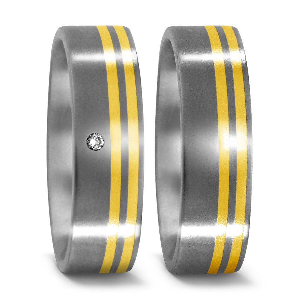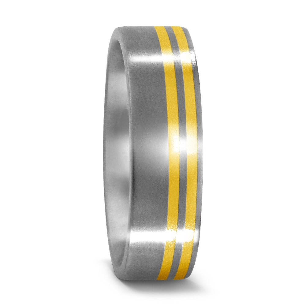 Moderner Fingerring aus robustem Titan mit edlen, zwei feinen 750er Gelbgoldstreifen. Das zeitlose Design verbindet Langlebigkeit und Eleganz für jeden Anlass. Ideal für stilbewusste Träger, die Wert auf hochwertigen Schmuck legen. Perfekte Kombination aus Matte und Glanz.