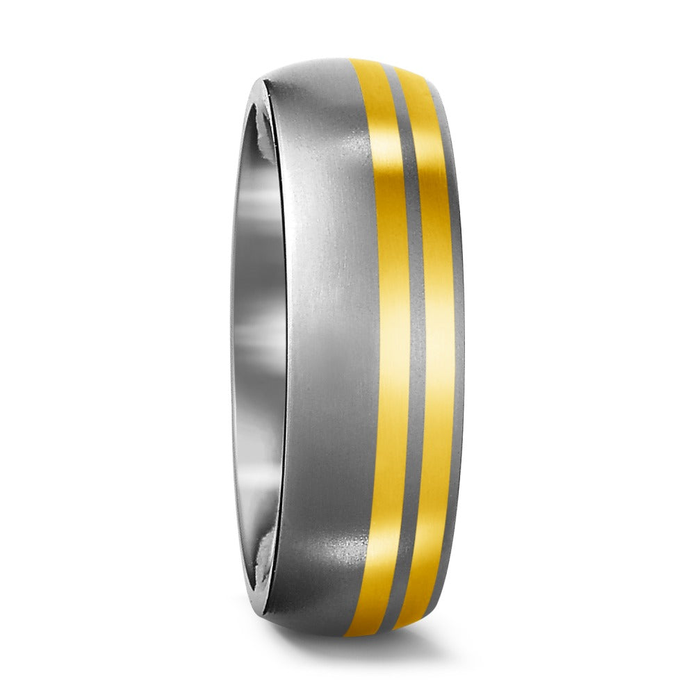 Eleganter Fingerring aus robustem Titan mit zwei glänzenden Streifen aus 750 Gelbgold. Die Kombination aus mattem Grau und strahlendem Gelbgold verleiht dem Ring eine zeitlose und moderne Note. Perfekt für stilbewusste Träger, die Wert auf Qualität und Design legen.