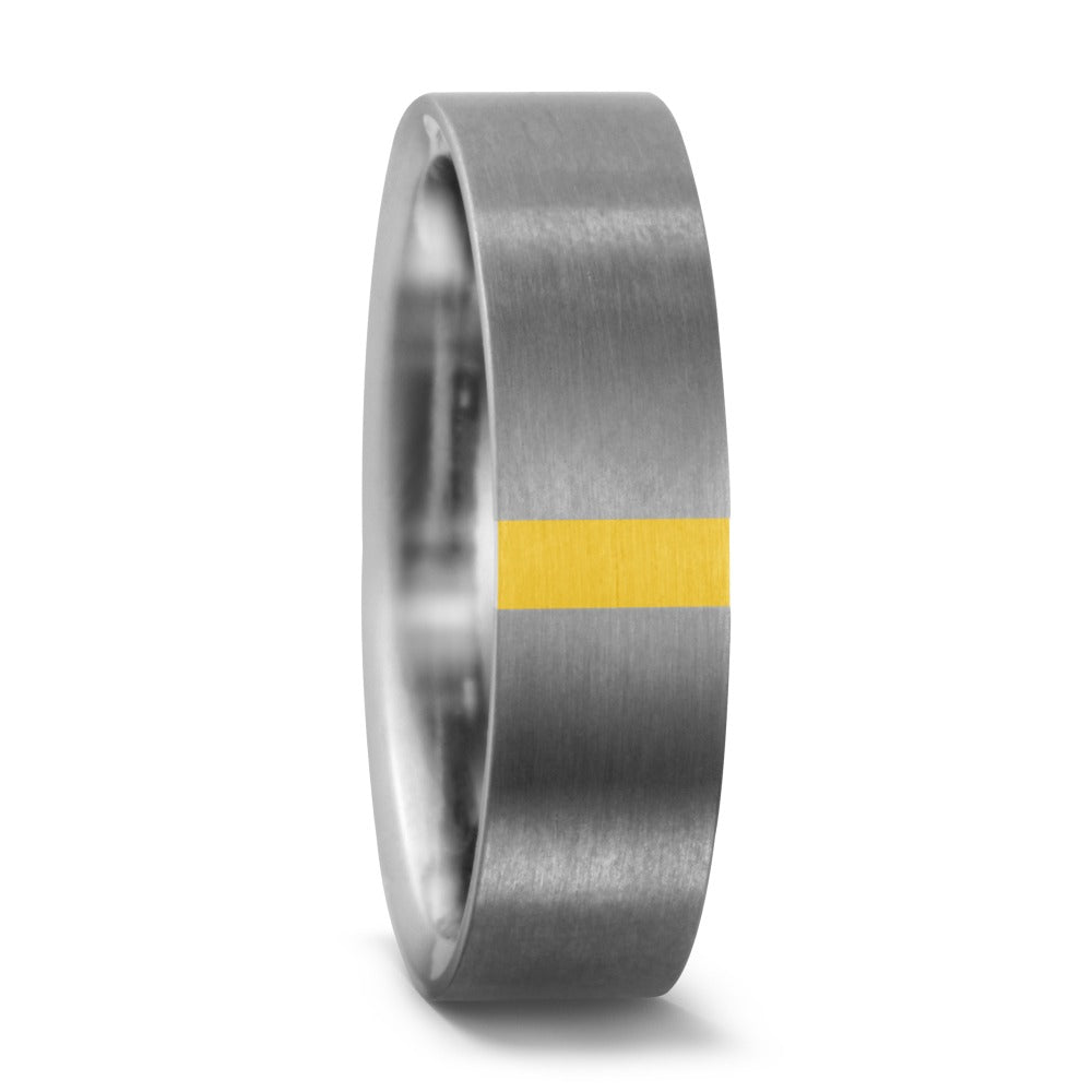 Moderner Fingerring aus widerstandsfähigem Titan mit einem eleganten Einsatz aus 750er Gelbgold. Der matte Ring überzeugt durch sein zeitloses Design und hochwertigen Materialmix – ideal für alle, die einen stilvollen und langlebigen Begleiter suchen. Perfekt für jeden Anlass.