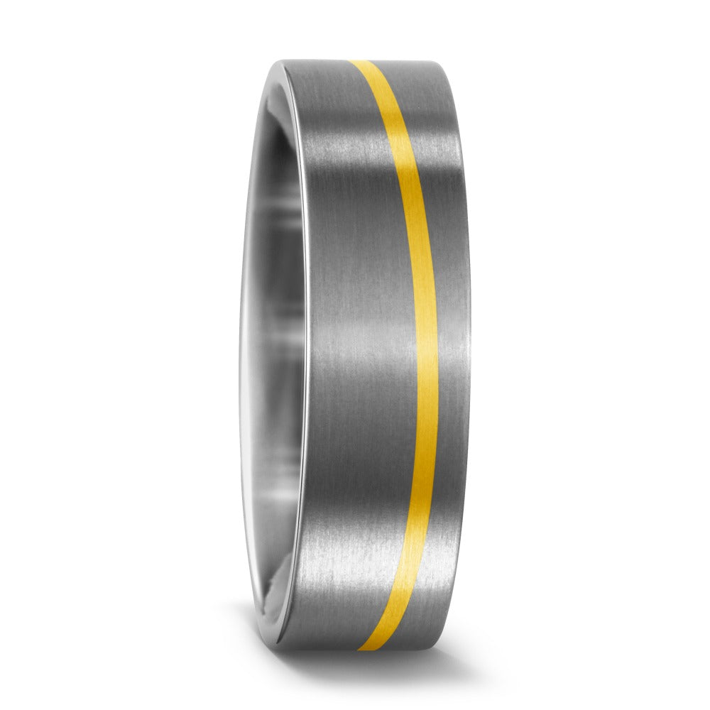 Moderner Fingerring aus robustem Titan mit edler 750er Gelbgold-Einlage. Das matte Finish und der schmale goldfarbene Streifen verleihen dem Ring einen stilvollen und zeitlosen Look. Perfekt für jeden Tag oder als besonderes Geschenk. Hochwertige Verarbeitung garantiert.