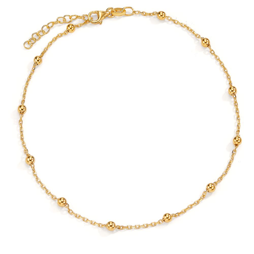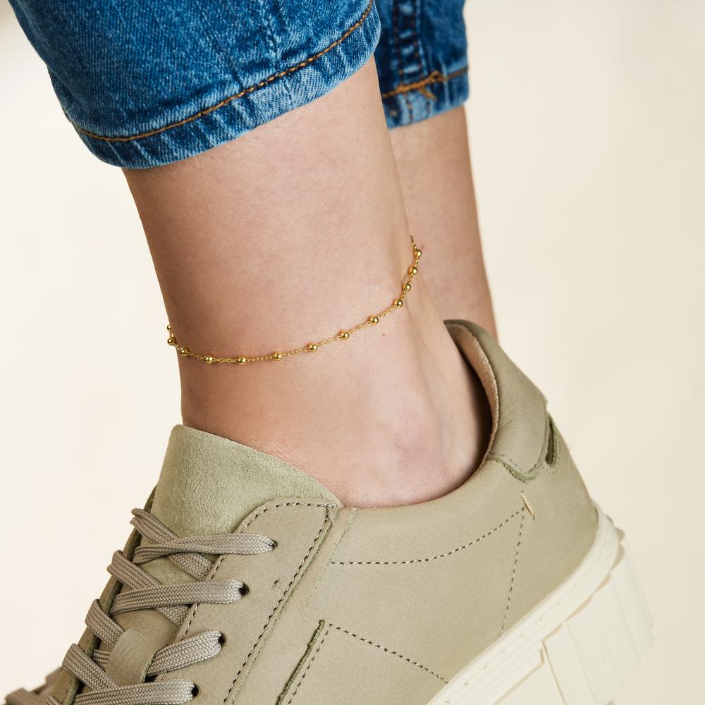 Elegantes Damen Fußkettchen aus hochwertigem Silber mit feiner Vergoldung. Die zarten Kettenglieder werden von gleichmäßig verteilten kleinen Kugeln geschmückt, die dem Schmuckstück eine feminine und stilvolle Note verleihen. Verstellbare Länge für perfekten Sitz. Ideal für jeden Anlass.