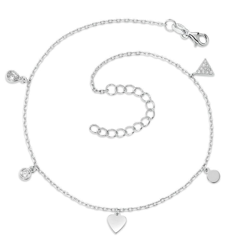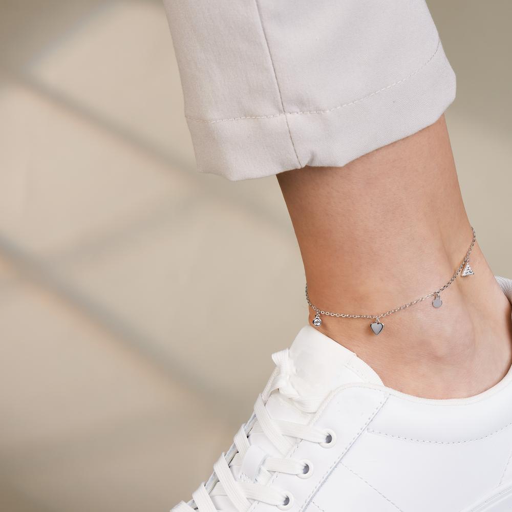 Elegantes Damen Fußkettchen aus hochwertigem Silber, verziert mit funkelnden Zirkonia-Steinen. Das filigrane Design mit verschiedenen Anhängern, darunter Herz und geometrische Formen, verleiht jedem Outfit eine charmante und feminine Note. Verstellbare Länge für perfekten Sitz.