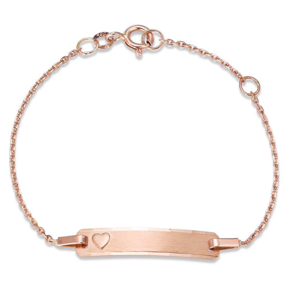 Zartes Baby Gravurarmband aus 585 Rotgold mit feinem Herzmotiv. Ideal als individuelles Geschenk zur Geburt oder Taufe. Die Gravurplatte bietet Platz für eine persönliche Botschaft oder Namen. Hochwertig, elegant und liebevoll gestaltet – ein besonderer Begleiter fürs Leben.
