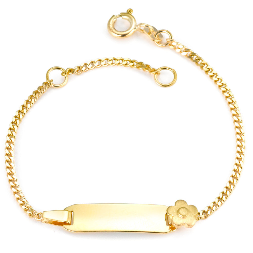 Dieses zarte Baby-Gravurarmband aus 750er Gelbgold besticht durch seine elegante Kettengliederung und eine liebevoll gestaltete Blumenapplikation. Die polierte Platte bietet Platz für eine individuelle Gravur – ein besonderes Geschenk für die Kleinsten.