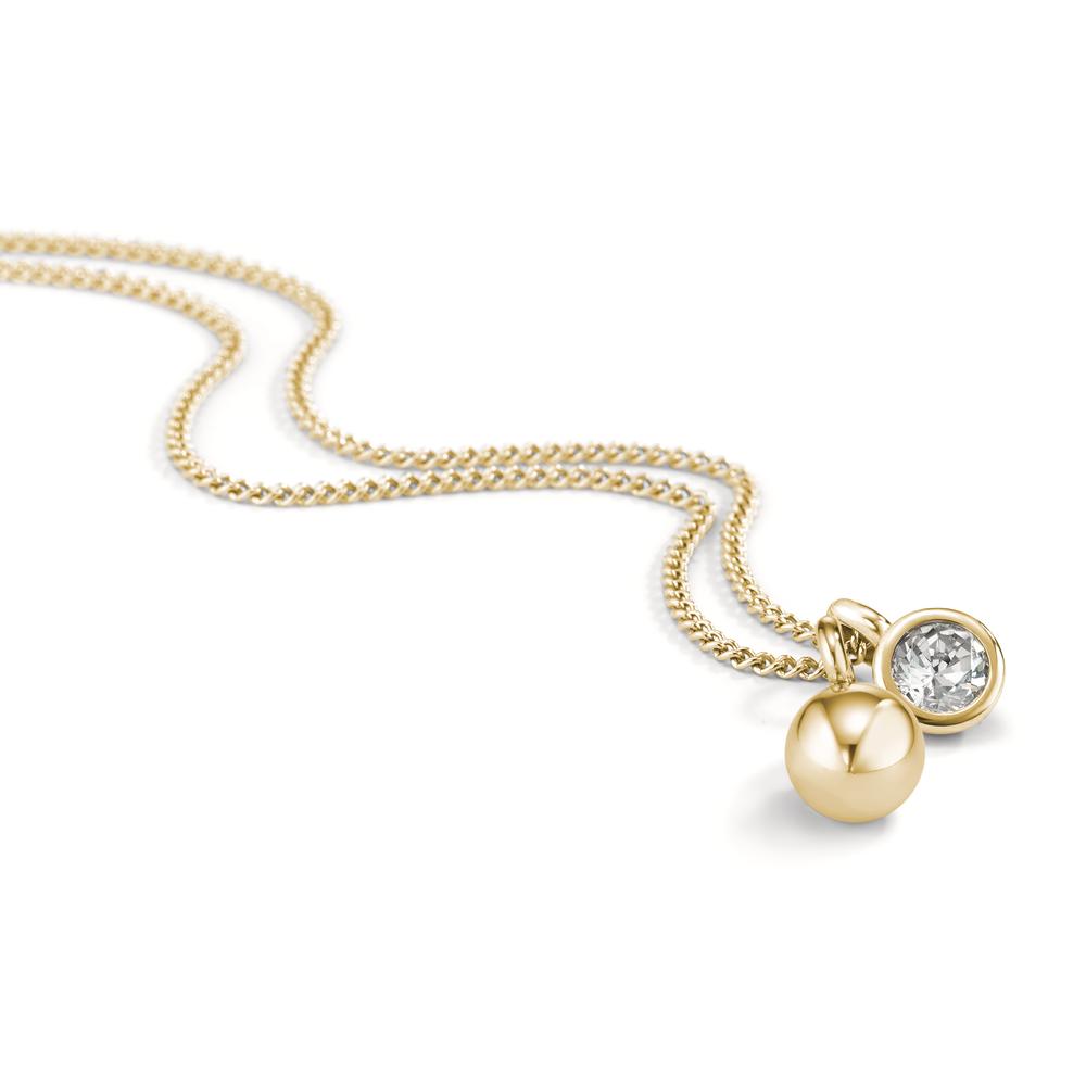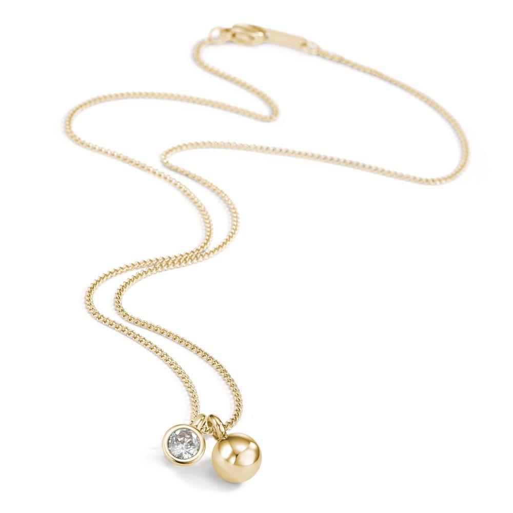 Elegantes Damen-Collier aus hochwertigem Edelstahl mit goldfarbener Beschichtung. Der Anhänger kombiniert eine glänzende Kugel und einen funkelnden Zirkonia-Stein, der jedem Outfit einen edlen Glanz verleiht. Ideal für stilbewusste Frauen, die zeitlose Eleganz lieben.