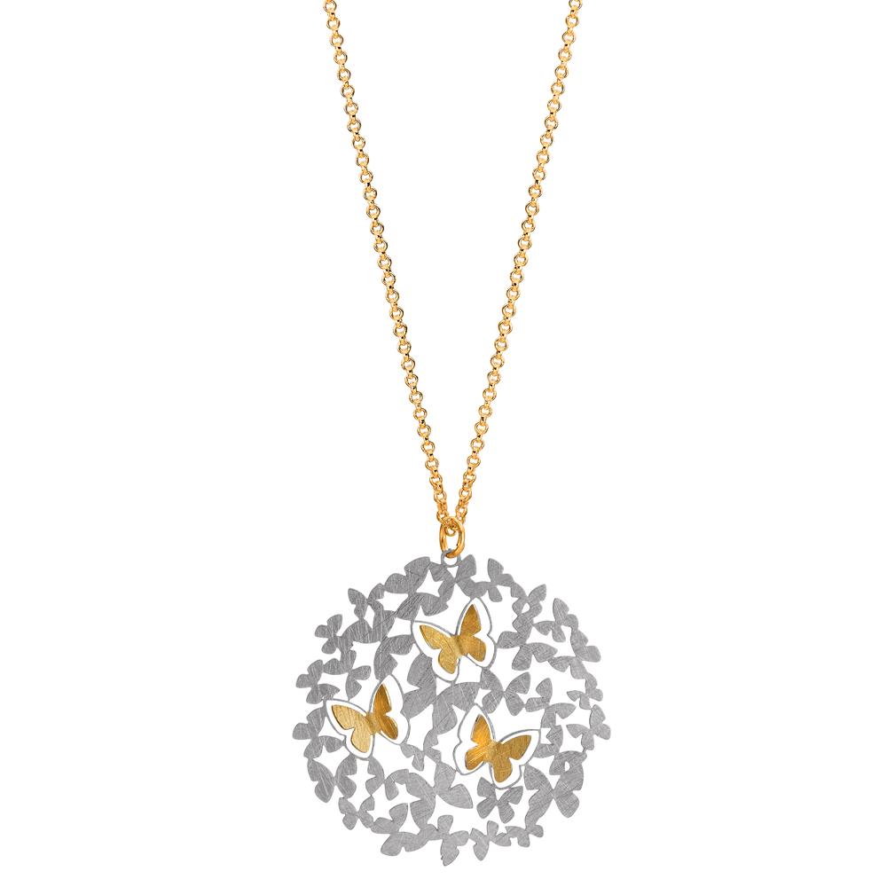 Elegante Damen Halskette aus Bronze mit zauberhaftem Schmetterlings-Anhänger. Feines Design mit filigranen, teils goldfarbenen Schmetterlingen auf rundem Anhänger. Perfektes Accessoire für einen femininen Look, ideal für jeden Anlass. Ein stilvolles Schmuckstück!