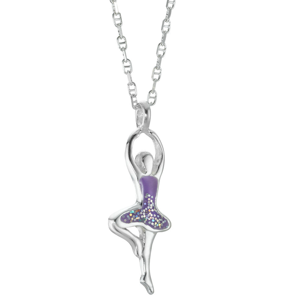 Elegante Mädchen-Halskette aus Silber mit bezauberndem Balletttänzer-Anhänger. Der Anhänger zeigt eine tanzende Ballerina mit lilafarbenem Kleid und funkelnden Details. Ein zauberhaftes Accessoire für kleine Tanzfans und ein besonderes Geschenk.