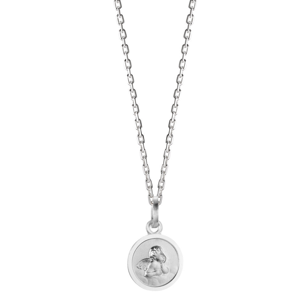 Zarte Halskette aus hochwertigem Silber mit rundem Anhänger, der einen liebevollen Schutzengel zeigt. Perfekt für Mädchen, die ein besonderes Schmuckstück mit Bedeutung suchen. Ein symbolträchtiges Geschenk, das Schutz und Geborgenheit vermittelt – zeitlos und elegant zugleich.