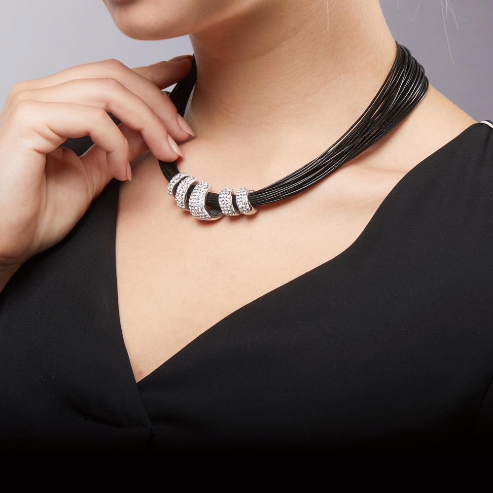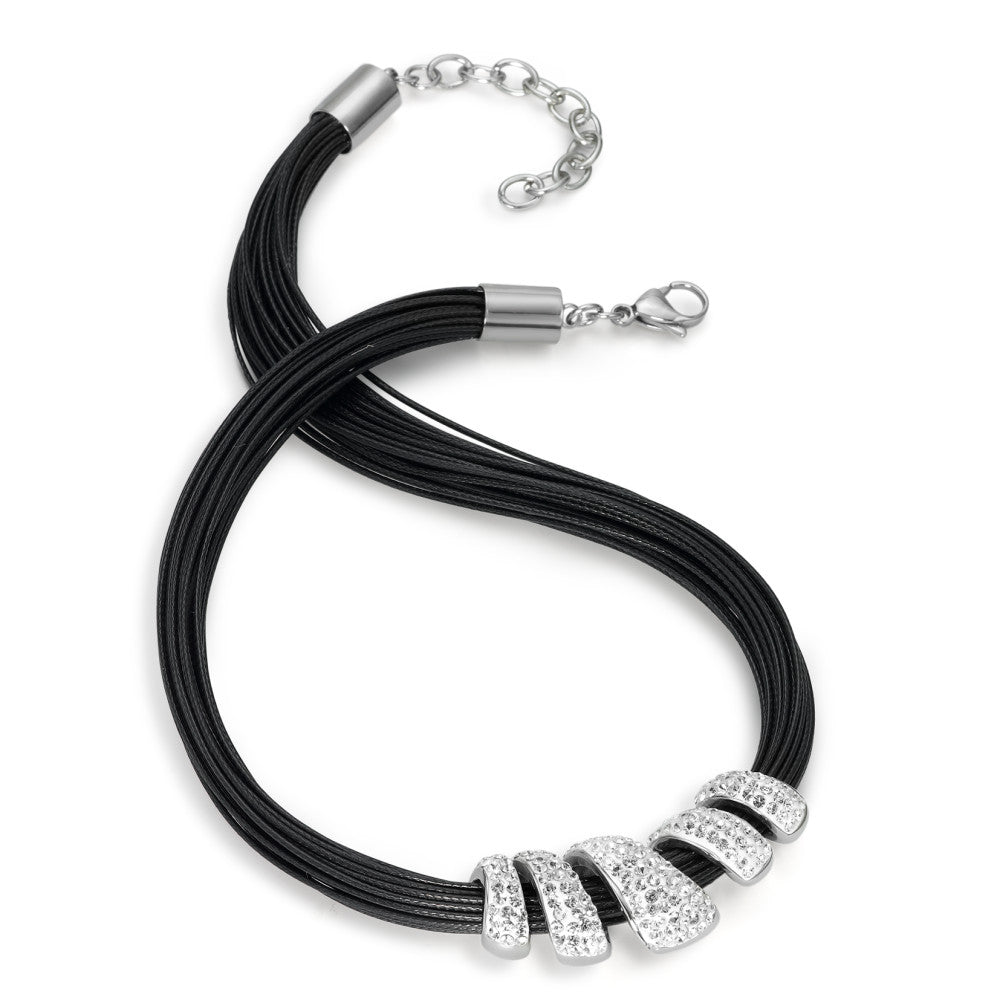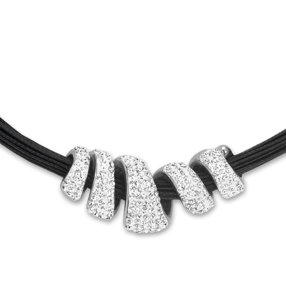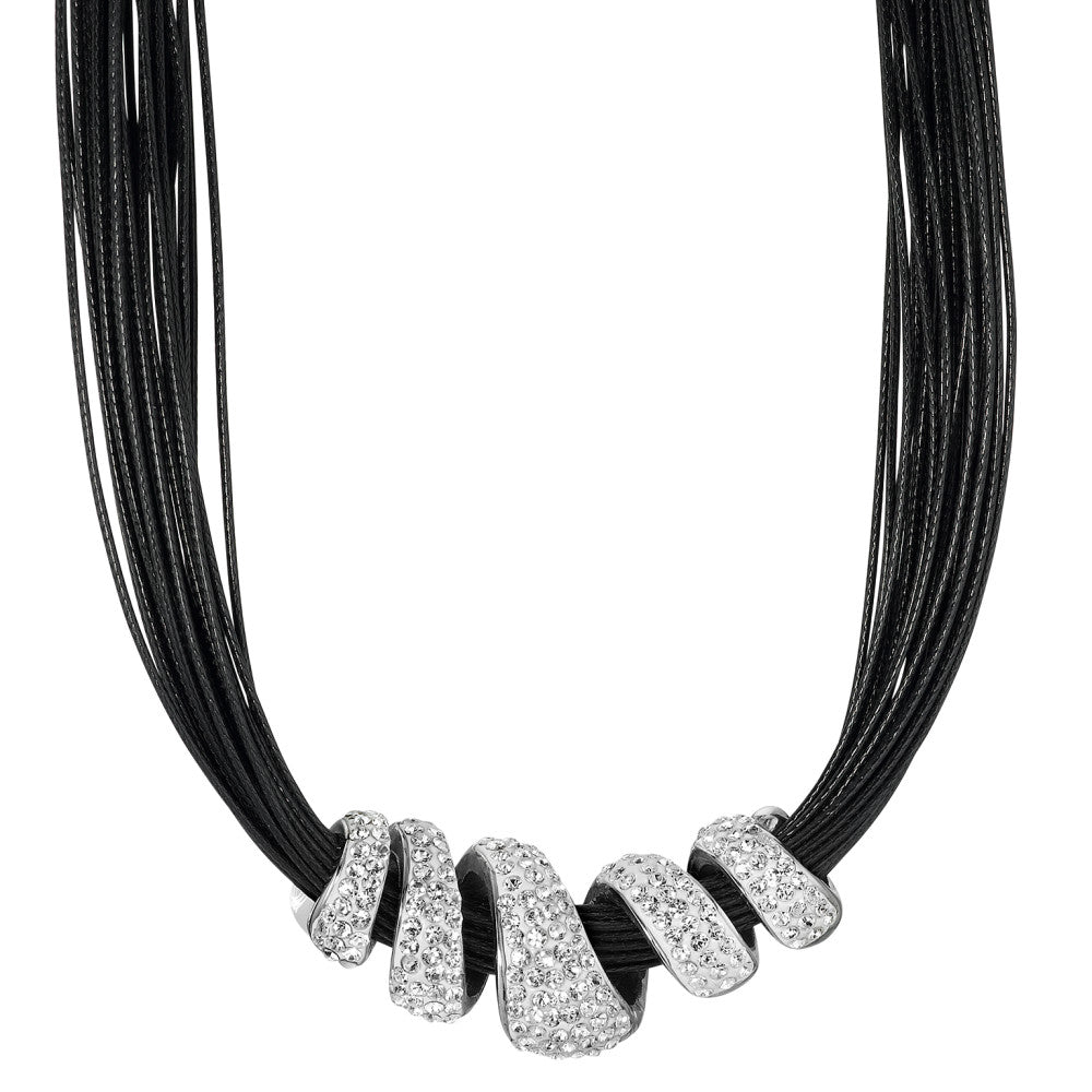 Elegantes Damen-Collier aus hochwertigem Edelstahl, verziert mit funkelnden Zirkonia-Steinen. Die mehrreihige schwarze Kordel setzt einen modernen Kontrast zum strahlenden Anhänger und macht das Schmuckstück zum stilvollen Accessoire für jeden Anlass.
