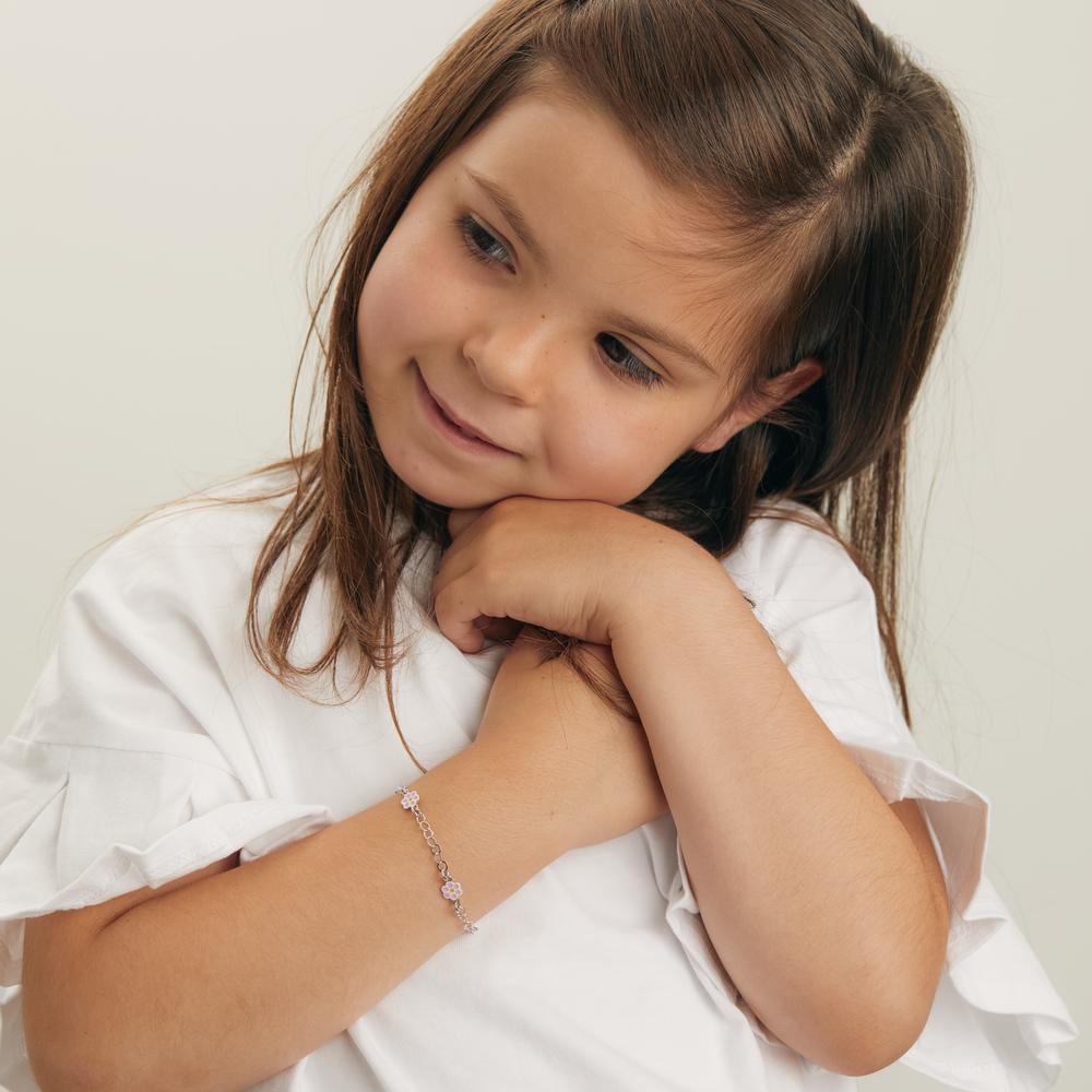 Dieses zarte Mädchen-Armband aus hochwertigem Silber besticht durch drei süße Blumenanhänger mit rosa Emaille-Details. Mit verstellbarer Länge und sicherem Karabinerverschluss ist es das perfekte Accessoire für kleine Blumenfreunde – leicht und bequem zu tragen.