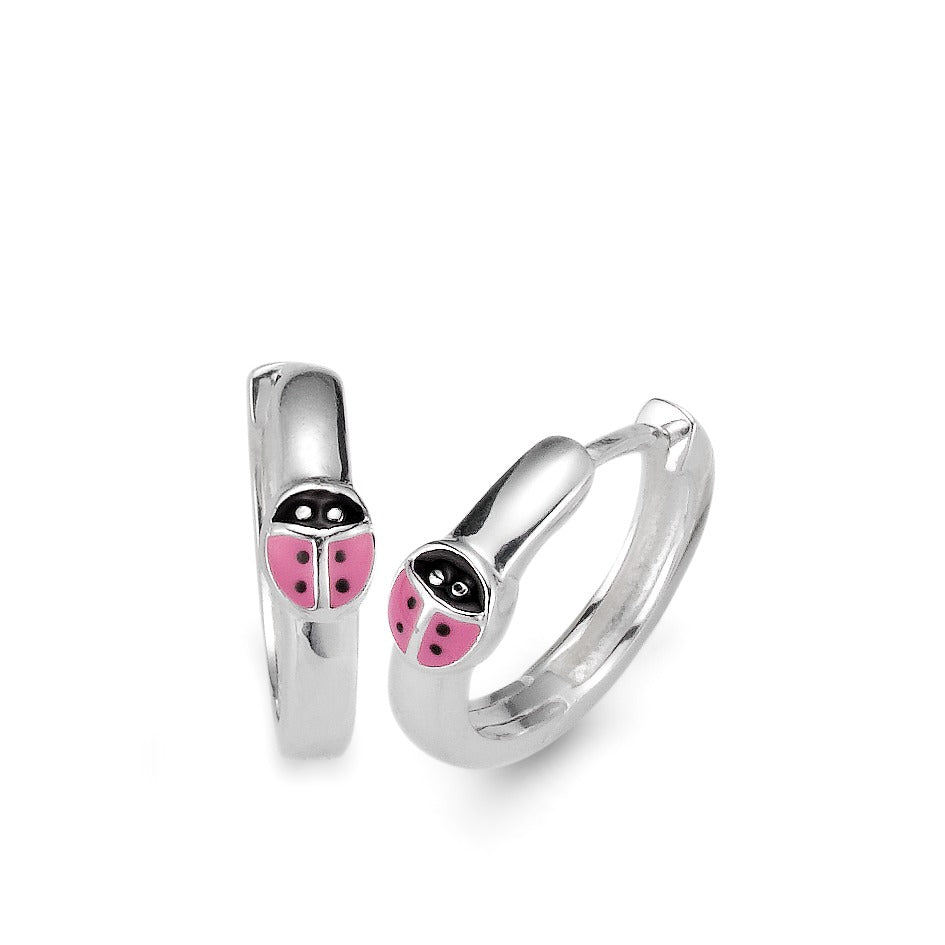 Niedliche Klappcreolen aus hochwertigem Silber, verziert mit liebevoll gestalteten Marienkäfern in zartem Rosa. Ideal für kleine Mädchen, die einen verspielten und charmanten Schmuck lieben. Sicherer Verschluss für bequemen und sicheren Halt im Alltag.