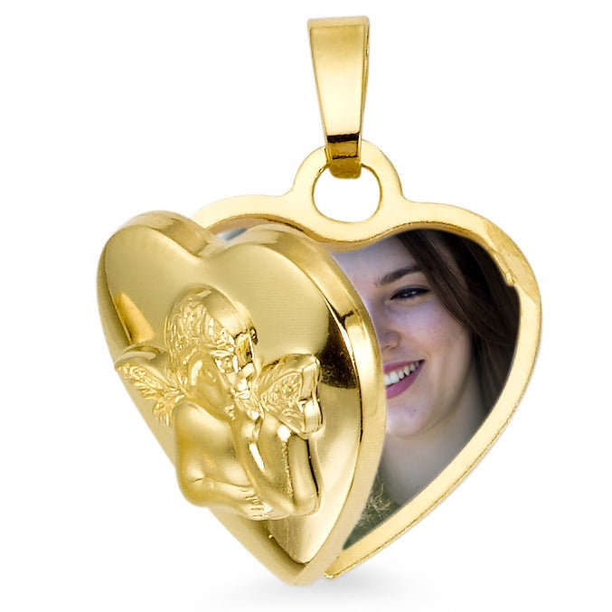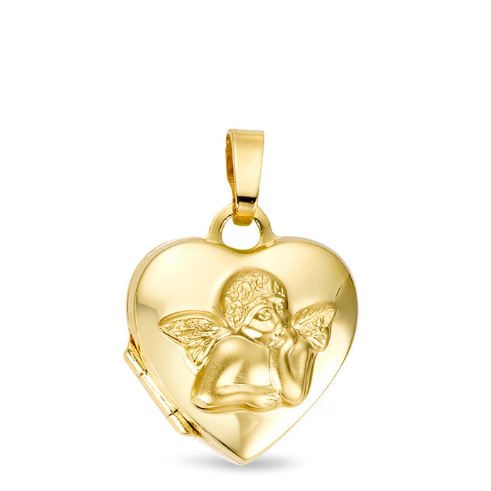 Dieses bezaubernde Baby Medaillon aus 375er Gelbgold zeigt einen liebevoll gestalteten Schutzengel auf der Vorderseite. Das herzförmige Medaillon lässt sich öffnen und bietet Platz für ein kleines Foto. Ein zeitloses Schmuckstück voller Liebe und Schutz für Ihr Kind.