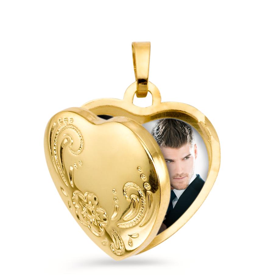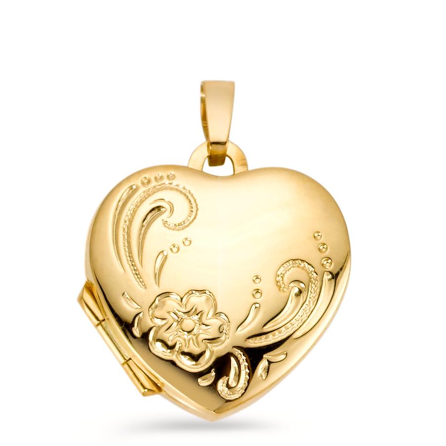 Edles Damen Medaillon aus 750er Gelbgold in Herzform. Feines, florales Muster verziert die Oberfläche und verleiht dem Schmuckstück eine charmante Eleganz. Perfekt zum Aufbewahren von besonderen Erinnerungen oder als stilvolles Geschenk. Zeitlos und hochwertig.