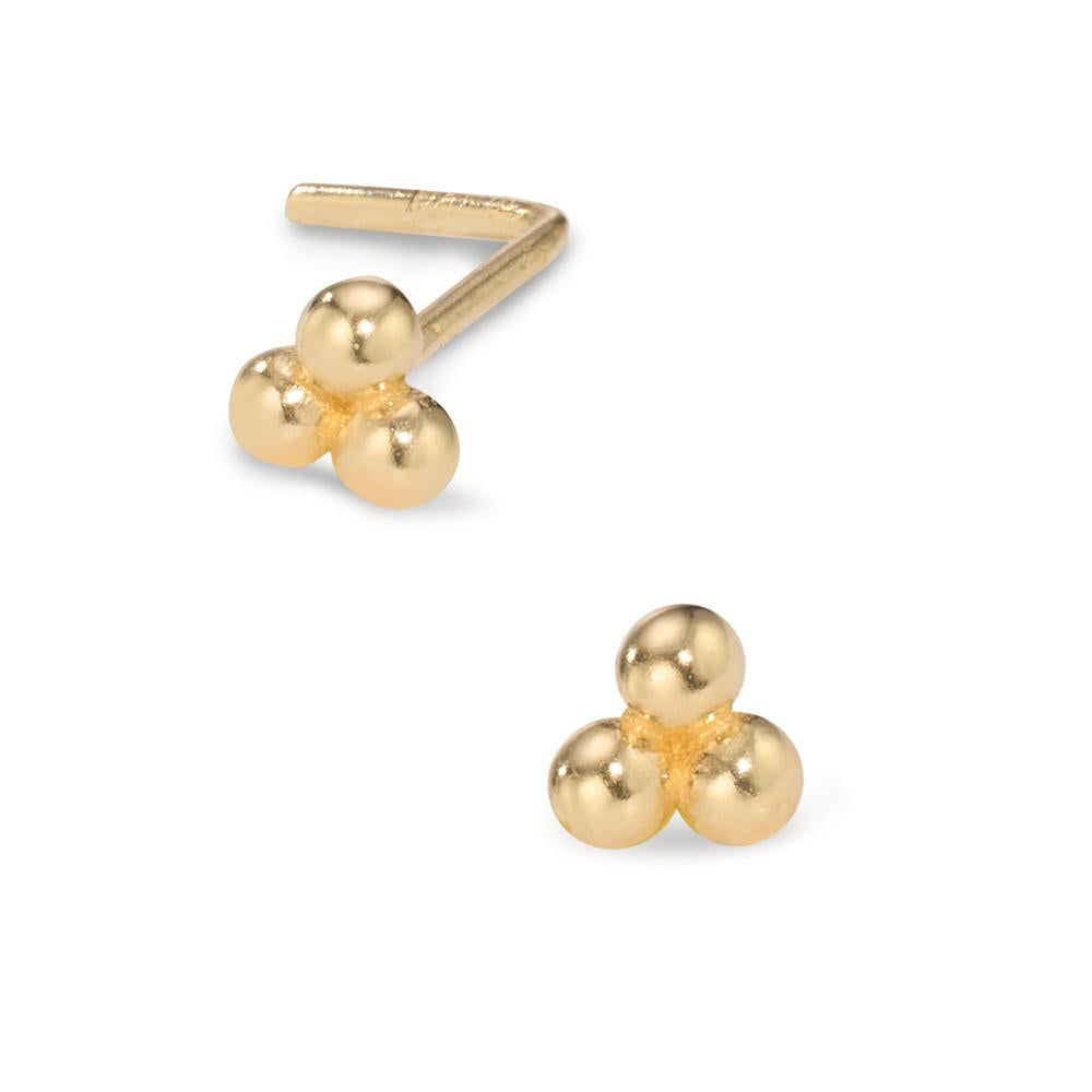 Feiner Damen-Nasenstecker aus 750er Gelbgold, bestehend aus drei kleinen, glänzenden Kugeln. Dezentes und elegantes Design, perfekt für den Alltag und besondere Anlässe. Hochwertige Handwerkskunst garantiert angenehmen Tragekomfort und langlebige Schönheit.