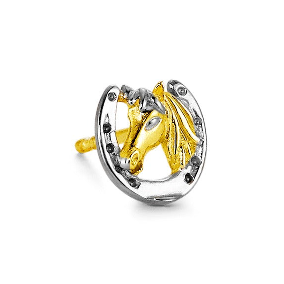Stylischer Herren-Ohrstecker aus 750er Gelbgold mit detailreichem Pferdekopf-Design. Das Hufeisen-Motiv in Silber mit schwarzen Akzenten symbolisiert Glück und Stärke. Ein einzigartiges Schmuckstück für Pferdeliebhaber, das Eleganz und maskulinen Charme vereint.
